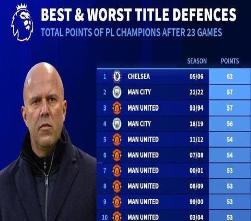 德国转会市场网站列出了英超历史上卫冕冠军在赛季前23场比赛过后的积分排行,本赛季的利物浦以36分排名倒数第五。英超历史卫冕冠军赛季前23场积分排行1 切尔西 2005-06赛季 6